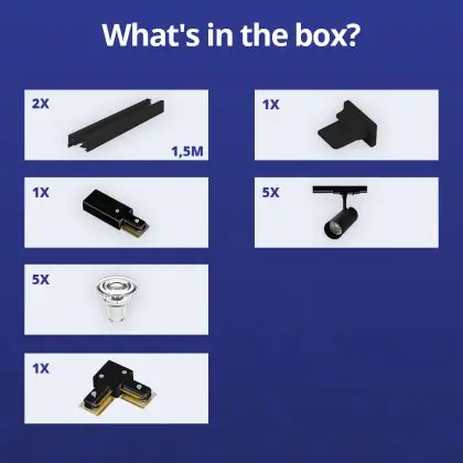 Beschreibung Bright Choice Komplettset 1-Phasen Rail L 1,5 x 1,5 Meter Schwarz | incl. 5x Spot + GU10 2700K 3W Dimmbar + Abschlusskappe, Stromanschluss und L -Verbinder