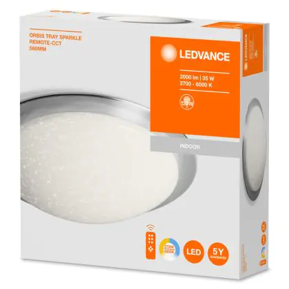 Die Ledvance LED Deckenleuchte Orbis Tray Sparkle 58W - 828 865 | Fernsteuerung CCT strahlt Licht in der Farbtemperatur 2700K - 6500K Tunable White aus und punktet durch eine lange Lebensdauer. Als Bulkhead kann diese moderne Leuchte sowohl an der Wand, als auch an der Decke montiert werden.