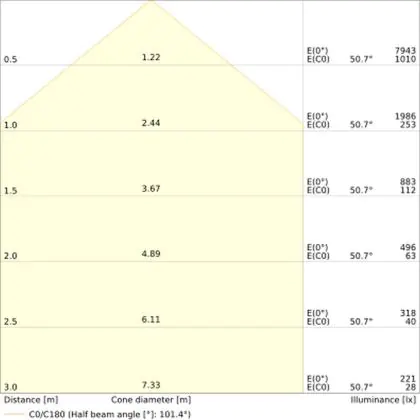 Der Abstrahlwinkel bezeichnet den Winkel, in dem das Licht aus der Lichtquelle ausgestrahlt wird. Er wird in Grad (D) angegeben. Je geringer die Gradzahl des Abstrahlwinkels ist, desto kleiner ist auch der Durchmesser des Lichtkegels, den die Lichtquelle produziert. Beispiel: Wird eine Lampe mit einem Abstrahlwinkel von 60 Grad an der Decke (2,5 m Höhe) angebracht, erzeugt sie einen Lichtkegel von 2,9 Metern Durchmesser. Hat die Lampe hingegen einen Abstrahlwinkel von 120 Grad, beträgt der Lichtkegel 8,7 Meter im Durchmesser. |