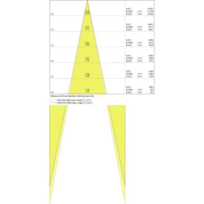 Der Abstrahlwinkel bezeichnet den Winkel, in dem das Licht aus der Lichtquelle ausgestrahlt wird. Er wird in Grad (D) angegeben. Je geringer die Gradzahl des Abstrahlwinkels ist, desto kleiner ist auch der Durchmesser des Lichtkegels, den die Lichtquelle produziert. Beispiel: Wird eine Lampe mit einem Abstrahlwinkel von 60 Grad an der Decke (2,5 m Höhe) angebracht, erzeugt sie einen Lichtkegel von 2,9 Metern Durchmesser. Hat die Lampe hingegen einen Abstrahlwinkel von 120 Grad, beträgt der Lichtkegel 8,7 Meter im Durchmesser. |