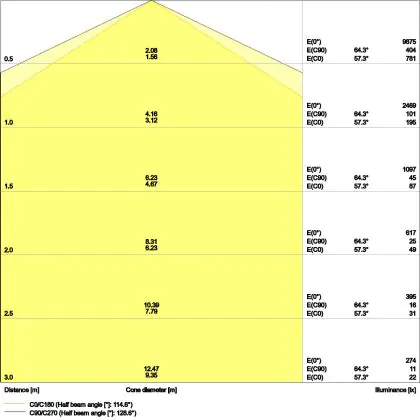 Der Abstrahlwinkel bezeichnet den Winkel, in dem das Licht aus der Lichtquelle ausgestrahlt wird. Er wird in Grad (D) angegeben. Je geringer die Gradzahl des Abstrahlwinkels ist, desto kleiner ist auch der Durchmesser des Lichtkegels, den die Lichtquelle produziert. Beispiel: Wird eine Lampe mit einem Abstrahlwinkel von 60 Grad an der Decke (2,5 m Höhe) angebracht, erzeugt sie einen Lichtkegel von 2,9 Metern Durchmesser. Hat die Lampe hingegen einen Abstrahlwinkel von 120 Grad, beträgt der Lichtkegel 8,7 Meter im Durchmesser. |