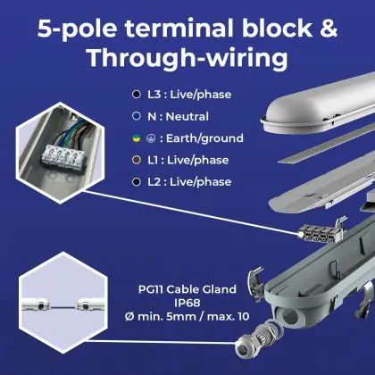 Die Noxion LED Feuchtraumleuchte Poseidon V3.0 30W 3900/4200lm - 830-865 CCT | 120cm - Durchgangsverdrahtung (5x2.5mm2) - Bewegungs- Und Lichtsensor ist eine Feuchtraumleuchte. Sie strahlt Licht in der Farbtemperatur 3000K - 4000K - 6500K CCT aus und punktet durch eine lange Lebensdauer. Diese Leuchte ist speziell zur Verwendung in Feuchträumen (Keller, Waschräume, etc.) vorgesehen.