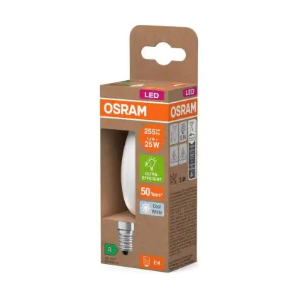 Die Osram LED Classic E14 Kerze Fadenlampe Matt 1.2W 255lm - 840 Kaltweiß | Ersatz Für 25W ist eine effiziente E14 LED-Lampe mit Retrodesign und der perfekte Ersatz für Ihre konventionellen 25W Lampen mit E14. Zudem strahlt sie Licht in der Farbtemperatur 4000K - Kaltweiß aus und punktet durch eine lange Lebensdauer.