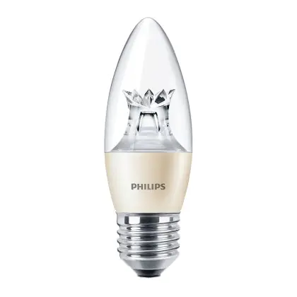 Die Philips MASTER LED Kerze E27 Krone Klar 5.5W 470lm - 822-827 Dim To Warm | Dimmbar - Ersatz Für 40W ist eine effiziente E27 LED-Lampe und der perfekte Ersatz für Ihre konventionellen 40W Lampen mit E27-Sockel. Zudem strahlt sie Licht in der Farbtemperatur 2200K - 2700K Dim To Warm aus und punktet durch eine lange Lebensdauer.