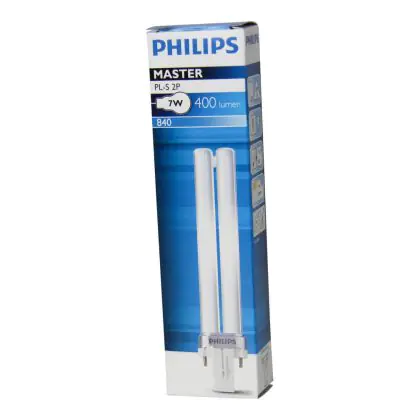 Philips PL-S 2P sind Kompaktleuchtstofflampen mit separater Spannungsversorgung. Sie sind kompatibel mit herkömmlichen Vorschaltgeräten. Mit einer Länge von 135mm, besitzen die Philips PL-S 7W 840 2P einen G23 Lampensockel mit 2 Pins.