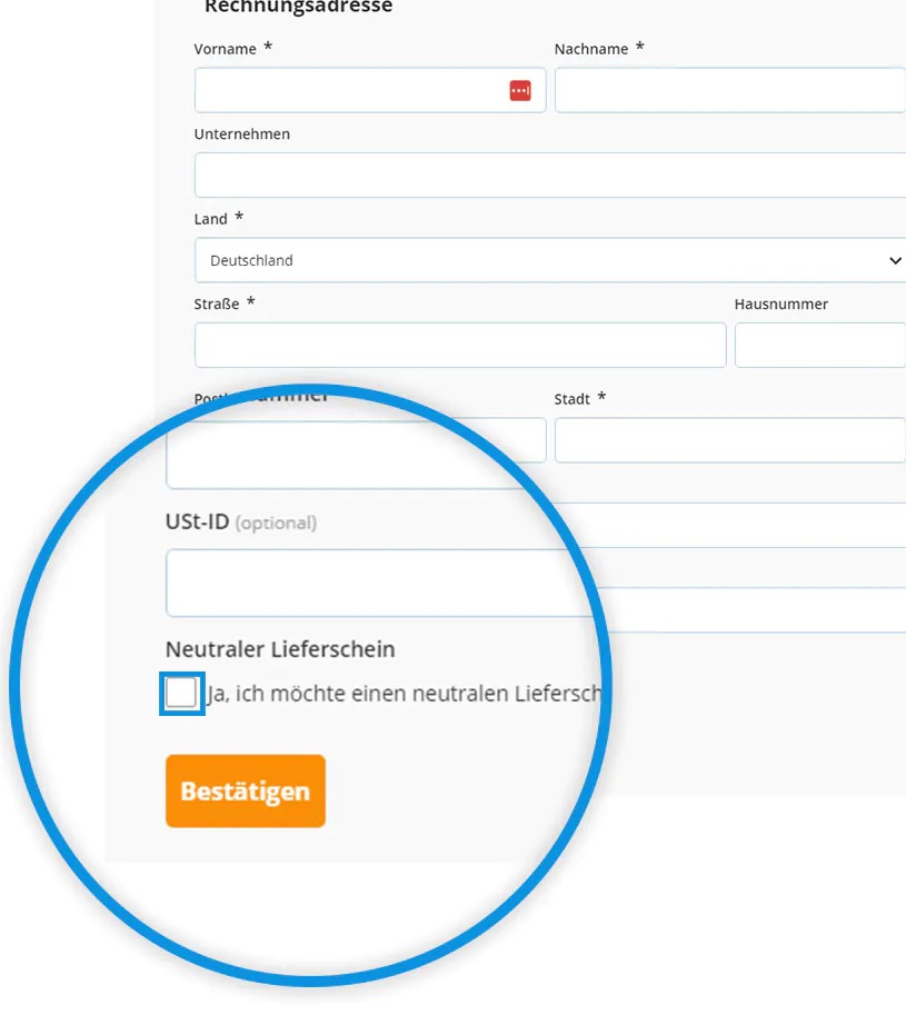 Beim Bezahlen können Sie einen neutralen Lieferschein anfordern, um die volle Kontrolle über den Lieferort Ihrer Bestellung zu behalten. Gehen Sie dazu einfach wie folgt vor: